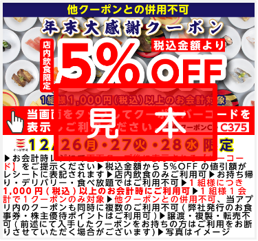 ・内容:店内飲食1,000円(税込)以上ご利用いただき、レジにてかっぱ寿司公式アプリ内の対象クーポンをご提示いただいたお客様のお会計税込金額を5%OFFいたします。