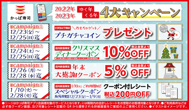 クリスマス&年末年始のお食事はかっぱ寿司で1年のご愛顧に感謝を込めて「ゆく年くる年4大キャンペーン」