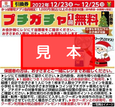 ・内容:店内飲食1,000円(税込)以上ご利用いただき、レジでかっぱ寿司公式アプリ内の「バーコード付引換券」をご提示いただいたお客様、