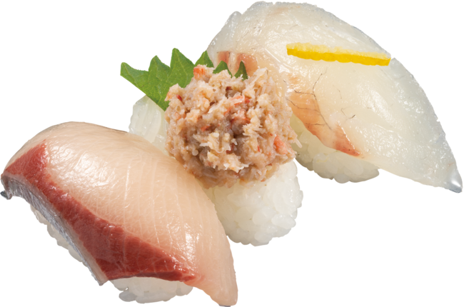 冬に向けて旨みがグンと増すネタを一度に三貫楽しめる一皿です。活〆寒ぶり、蟹みそ和え、柚子塩活〆真鯛を取り揃えました。