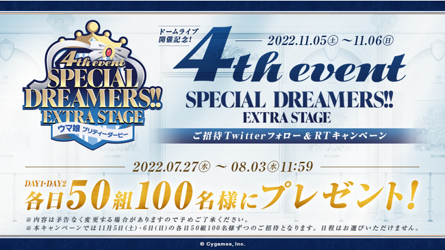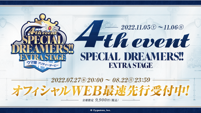 ゲームの企画・開発・運営事業を展開する株式会社Cygames(本社:東京都渋谷区、代表取締役社長:渡邊耕一)は、弊社が展開するクロスメディアコンテンツ『ウマ娘 プリティーダービー』について、2022年11月5日(土)、6日(日)にベルーナドームで開催予定の4thイベント追加公演の公演名を「ウマ娘 プリティーダービー 4th EVENT SPECIAL DREAMERS!! EXTRA STAGE」と発表しました。あわせて、特設サイトをリニューアルし、出走キャスト第1弾など、さまざまな情報を公開しました。