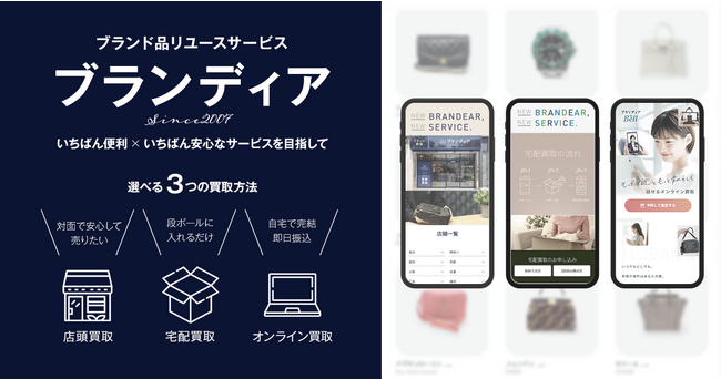 ブランディアは最も安心で便利なブランド品買取サービスを目指し、お客様のニーズに合わせ「宅配買取」「店頭買取」「オンライン買取」3つの買取方法を用意しています。