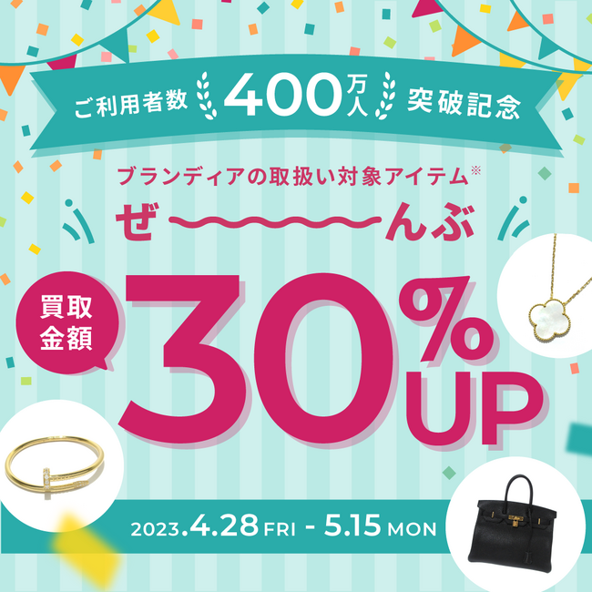 BEENOS株式会社(東証プライム 3328)の連結子会社で、株式会社デファクトスタンダード(本社:東京都大田区、代表取締役社長:仙頭健一、以下「デファクトスタンダード」)が運営する、プレラブド(Preloved=大切に使用された)なアイテムをサスティナブルな循環につなげる国内最大級のブランド買取・販売サービス「ブランディア」は、買取サービスの累計利用者数が400万人を突破したことを記念して、「ブランディア累計利用者400万人突破 大感謝キャンペーン」を開催いたします。本キャンペーンでは、2023年4月28日(金)から5月15日(月)の期間中、特設ページ(URL: https://brandear.jp/ct/campaign/4m_campaign )よりお申し込みいただいた方に限り、買取金額を30%アップいたします。