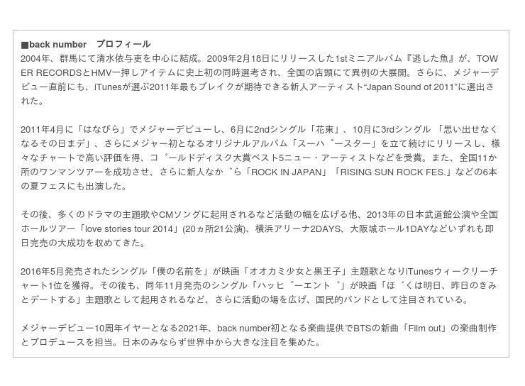内容:メジャーデビュー10周年の国民的バンドback numberの代表作7曲と共に彼らの魅力を紹介します。