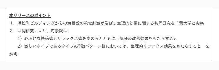 野村不動産株式会社(本社:東京都新宿区/代表取締役社長:松尾大作、以下「当社」)は、千葉大学環境健康フィールド科学センター(宮崎良文名誉教授、以下「千葉大学」)と2022年6月より浜松町ビルディングから見た海景観(以下、「海景観」)の視覚刺激が及ぼす生理的効果に関する共同研究を行い、その結果、海景観には脳活動・自律神経活動におけるリラックス効果があることが解明されました。