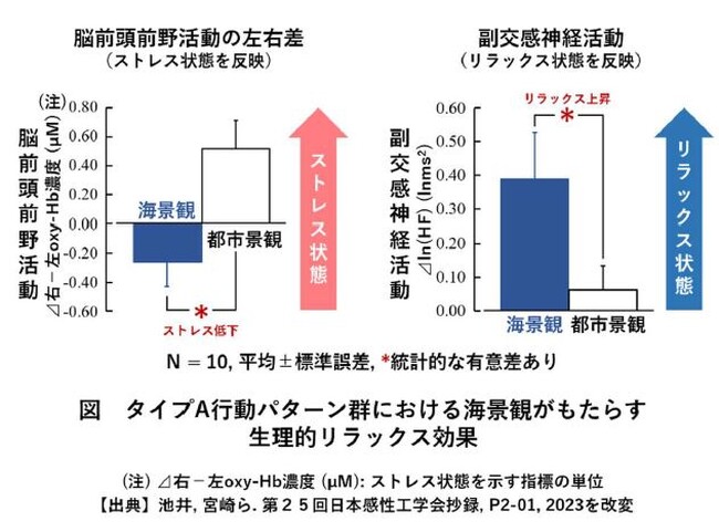 さらに海景観がもたらす生理的リラックス効果について、外向的で激しい行動特性を持つタイプA行動パターン群※1を抽出して深く分析したところ、図に示すとおり、顕著な生理的リラックス効果がもたらされることが解明されました。左に右前頭前野活動から左前頭前野活動を引いた差分を示しています。脳前頭前野活動の左右差(差分)は、「ストレス状態」を反映しており、海景観は、都市景観に比べ、「ストレス状態を低下」させることがわかりました。右には、副交感神経活動を示しました。副交感神経活動は、「リラックス状態」を反映しており、海景観は都市景観に比べて、「リラックス状態を上昇」させることが明らかになりました。