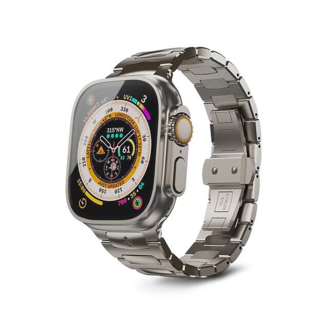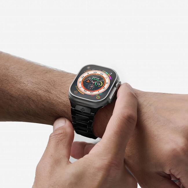 カラーバリエーションはスタイリッシュな色味で統一されており、チタニウムグレー、ブラック、シルバーの3色展開となっています。また、ストラップは全てアップルウォッチ45mm、49mm共に使用可能となっており、多彩なスタイルオプションを提供いたします。