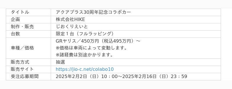 株式会社HIKE(本社:東京都新宿区、代表:三上 政高、以下「HIKE」)は、アクアプラス30周年記念で制作されたものコラボカー「GRヤリス」(制作・販売:じおくりえいと)のキャンセル分再抽選販売受付を2025年2月2日(日)10:00より開始いたします。販売台数は1台限定となっておりますので、この機会にぜひお申し込みください。