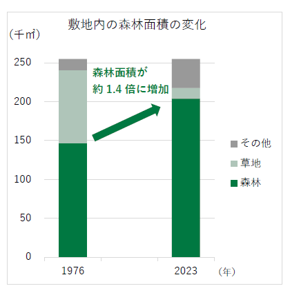 インパクトを詳細に評価するため、当社の開発開始前からの敷地内における森林面積の変化を、シンク・ネイチャーにより、1976年以降の空中写真や衛星画像を用い、森林/非森林の区別を推定し、森林面積の変化傾向を定量的に分析しました。その結果、開業に伴い建物用地が増えたものの、これを大きく上回る面積の森林が再生され、開発前後で比較すると森林面積割合は約1.4倍に増加していることが分かりました。「自然との調和」を方針とした整備・開業が天然林の保全・再生に寄与し、当社グループのリゾート開発・運営がネイチャーポジティブに貢献していると評価されました。
