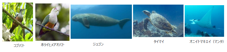 例えば、陸域では、コブバトなどの絶滅危惧種や、ホリイヒメアオバト(国鳥)などのパラオ固有種が生息しています。海洋では、レッドリスト種として有名なジュゴンなどの海棲哺乳やタイマイ、その他マンタの分布の豊富なエリアです。