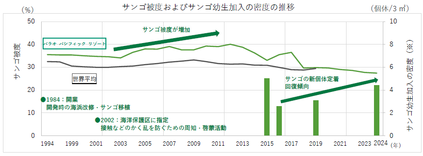 前面海域におけるサンゴ被度を、衛星画像による推測により時系列で分析しました。開発当初から海浜整備、サンゴ移植、前面海域の保護区指定、地域での啓蒙活動などの取り組みを実施し、2012年ごろまでサンゴ被度は増加していることが分かり、ネイチャーポジティブへ貢献していると評価されました。その後、気候変動の影響等による世界的な海水温上昇、大型台風の発生や極端な潮位の低下、生物による食害などの外部要因により近年は減少傾向にありましたが、2025年からアジア開発銀行とのパートナーシップによりサンゴ礁回復プロジェクトを新たに開始し、サンゴの早期育成・養殖を行っています。施設前面のアラカベサン海洋保護区での最新のモニタリング調査では、サンゴの新個体の定着(幼生加入*5)が増加しているとの結果が出ています。