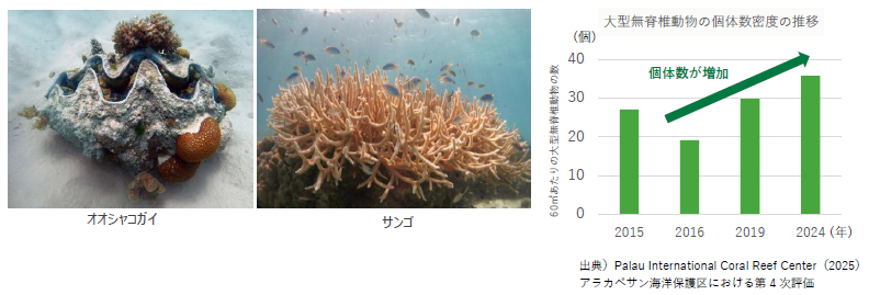 シャコガイはサンゴ礁に生息する海洋生物です。シャコガイとサンゴは共に、体内に褐虫藻という光合成をおこなう藻類を共生させていることから、シャコガイとサンゴには密接な関係があります。パラオ パシフィック リゾートでは、1998年から、絶滅危惧種であるオオシャコガイの放流の取り組みを行っています。施設前面の海洋保護区におけるモニタリング評価からは、シャコガイを含む大型無脊椎動物個体数は増加しており、このような保護・再生の取り組みが増加に有効に働いていることが分かりました。