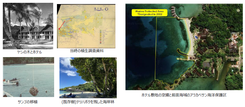 1956年、東急不動産初代社長五島昇が日本の民間人として戦後初めて入国し、「ヤシの木より高い建物は建てるなよ」という指示の下、「自然と開発の両立」「地元に貢献し地元の人々に受け入れられる事業」をコンセプトに、まだ戦争の傷跡が残るこの地で事業をスタートしました。事前に、東急不動産の子会社である株式会社石勝エクステリアによって、植生等に関する綿密な環境調査を実施した上で、自然保護のため最大限既存樹木を生かすとともに、環境調査も踏まえ、サンゴの移植等も含め施設前面の海岸を改修しました。