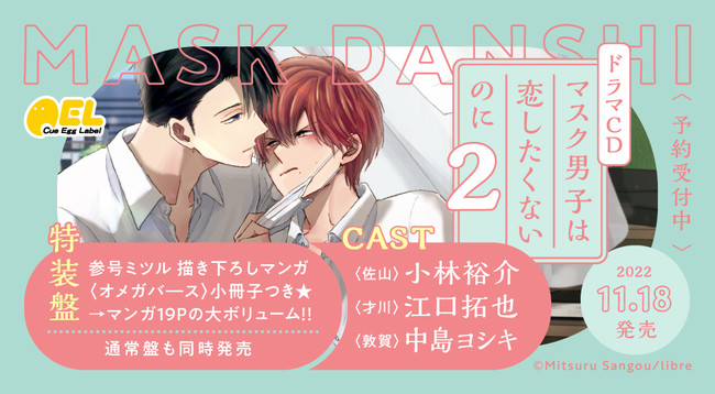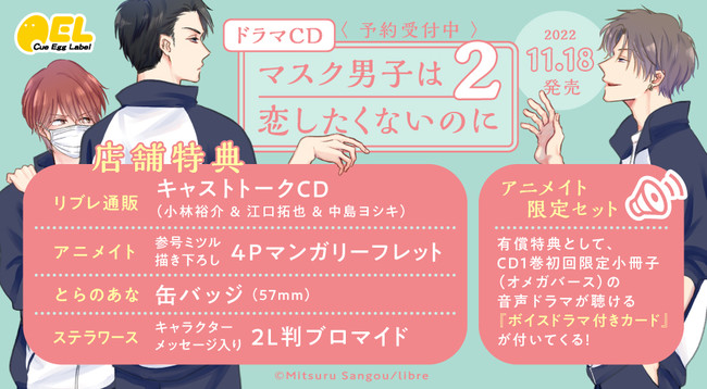 株式会社リブレ(本社:東京都新宿区、代表取締役社長:太田歳子)は、2022年11月18日にドラマCD「マスク男子は恋したくないのに2」をCue Egg Labelより発売いたします。https://www.b-boy.jp/special/masukudanshi/cd/