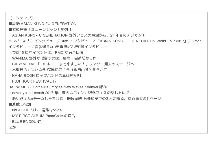 10 号目を迎えた『ぴあMUSIC COMPLEX』の特集は、「ミュージシャンと野外!」。昨年20 周年を迎え、ワールドツアーを終えたばかりのASIAN KUNG-FU GENERATION を大特集し、彼らを大阪の野外フェスティバルで直撃。21 年目のアジカンを語ってもらいました。WANIMA は「ROCK IN JAPAN FESTIVAL 2017」での勇姿、6 月に行われた初の野外ワンマンフリーライブの後日談を。また、BABYMETALは「SUMMER SONIC 2017」にてセカンドヘッドライナーとして登場したマリンスタジアムライブの模様を。初出演からステージを大きくしてきた彼女たちの、堂々のパフォーマンスをレポートします。そして、水曜日のカンパネラには、圧倒的な世界観を作り上げたライブ芸術をフェスの現場でどう表現するのか? とても有意義な話を聞きました。