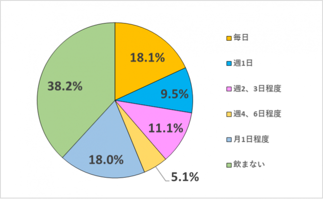 どのくらいの頻度で飲みますか?の質問に対し、お酒を飲む頻度で1番多かったのは、「毎日」で18.1%、僅差で「月1日程度」の18.0%が2番目となりました。約56.0%の人が週1日以上、お酒を飲むという結果になりました。
