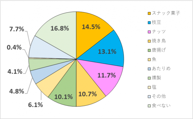 どのようなおつまみを食べますか?という質問では、「スナック菓子」が14.5%と1番多く、2番目は「枝豆」で13.1%、3番目は「ナッツ」で11.7%とあまり大差がない結果となりました。約8割の方が何かしらのおつまみを食べながらお酒を楽しんでいるようです。