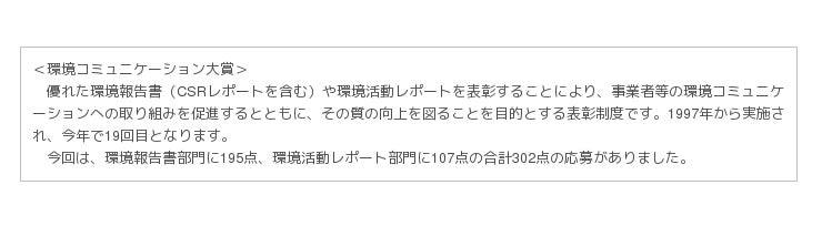 今回の受賞により、当社は2年連続4度目の「環境コミュニケーション大賞」受賞となります。