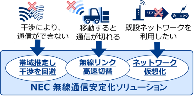 ※NEC 無線通信安定化ソリューションは、国立研究開発法人新エネルギー・産業技術総合開発機構(NEDO)が管理法人として運営を支援する内閣府「戦略的イノベーション創造プログラム(SIP)第2期/フィジカル空間デジタルデータ処理基盤」の研究成果および、国立研究開発法人情報通信研究機構(NICT)の研究成果を活用し、NEC が開発したものです。