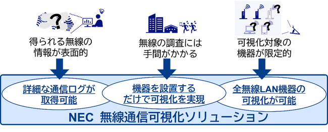 「NEC 無線通信可視化ソリューション」では、対象エリアに無線センサを設置するだけで、全ての無線LAN機器の通信品質のモニタリング及び詳細な通信ログの取得が可能になります。これにより、リアルタイムだけでなく過去の状況も含めた無線LANのヘルスチェックが可能になり、トラブルの解決やエリア設計の最適化に貢献します。