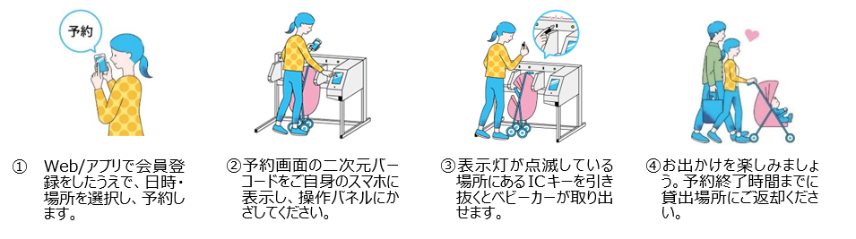 お子さま連れでの移動の利便性向上を目指して導入いたします。駅周辺での小さなお子さまとのお買い物やお食事、ちょっとしたお散歩にご利用いただけます。ぜひご利用ください。