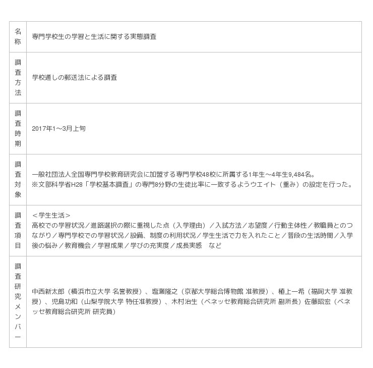 株式会社ベネッセホールディングス(本社:岡山市)の社内シンクタンクであるベネッセ教育総合研究所は、2017年1月から3月にかけて、全国の専門学校生9,484名を対象に「専門学校生の学習と生活に関する実態調査」を実施しました。 専門学校は、高卒者の2割(過年度含む)の進学先でありながら、その教育の「中身」について十分に明らかにされないまま、「職業に直結する資格やスキル習得の場」といったイメージで語られてきました。そこで本調査では、専門学校生がどのように学び、生活しているのか、その意識や行動の実態を現役生の視点から把握することを試みました。