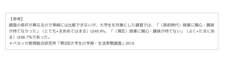 高校時代と比べて、「授業に関心・興味がもてない」と回答した生徒が約3人に1人まで減少。
