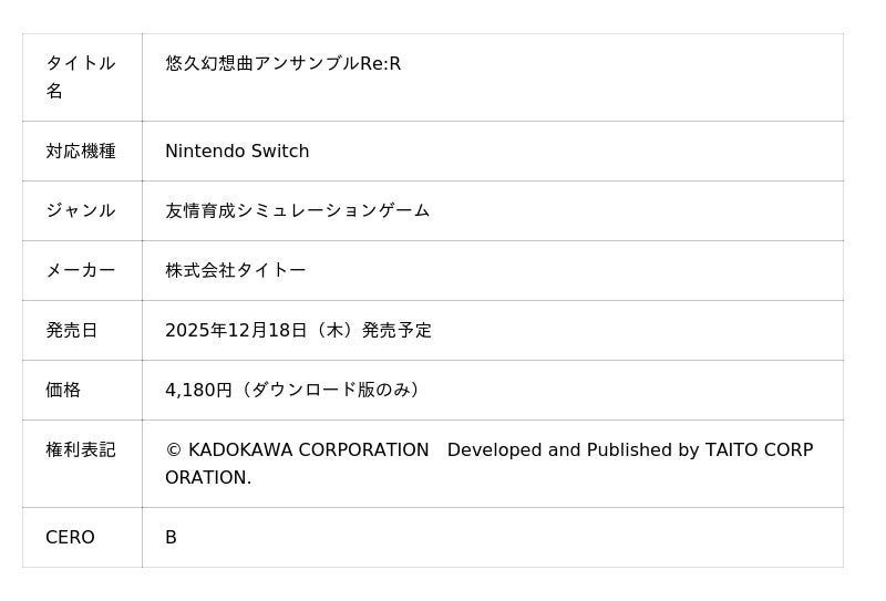 株式会社タイトー(本社:東京都新宿区、以下タイトー)は、12月18日(木)発売予定のNintendo Switch(TM)用ダウンロード専用の追加コンテンツ『悠久幻想曲アンサンブルRe:R』について、オリジナル版の主題歌も担当した畑亜貴氏によるセルフカバー楽曲をオープニング曲として起用することをお知らせいたします。本日、オープニングムービーも公開いたします。