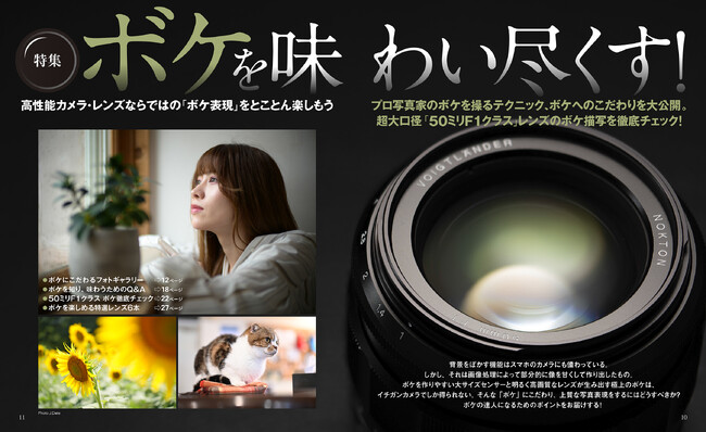 そこで本特集では、「ボケ」描写の達人になるためのポイントを大公開。プロ写真家の極上のボケを操るテクニック、ボケへのこだわりを紹介するほか、超大口径「50ミリF1クラス」レンズのボケ描写を徹底チェック。さらに、ボケについて理解が深まるQ&Aやボケ味を楽しめる特選レンズも紹介します。