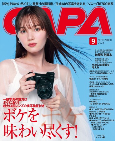 特集は「ボケを味わい尽くす!」。50ミリF1クラスのボケ描写の検証からボケQ&A、ボケを楽しめる特選レンズまで、徹底的にボケ味、ボケ描写について解説&紹介します。第2特集は「生成AIの脅威と実力」。画像生成AIアプリを使った実践と現状をお伝えします。さらに、「今年は撮るぞ! 秋祭り撮影徹底ガイド」や30回目を迎えた「写真甲子園2023レポート」、HASEOさんのグラビアなども必見。CAPA9月号もカメラ・写真を楽しむための記事が満載です。