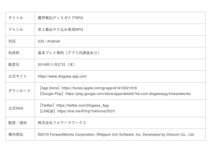 『魔界戦記ディスガイアRPG』は、シリーズの世界観や、Lv9999まで育てて億を超えるダメージを叩き出す育成などのやり込み要素を継承しながらも、「魔界戦記ディスガイア」シリーズの歴代キャラクターたちが登場するオリジナルストーリーや、いつでもどこでもサクサク遊べるコマンドバトルを採用し、スマートフォン向け完全オリジナルゲームとしてお楽しみいただけます。