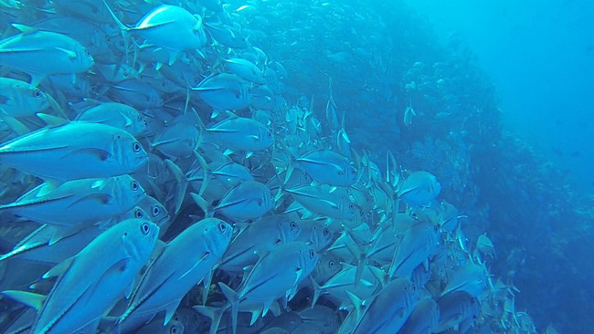 この海の最大の見ものと言われる、巨大な竜巻のような群れで移動するアジ。そのうねりはまさに圧巻です。