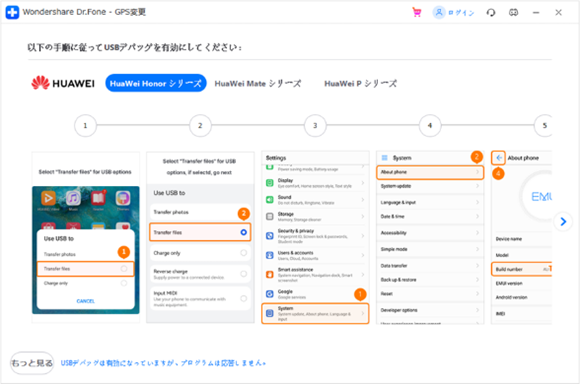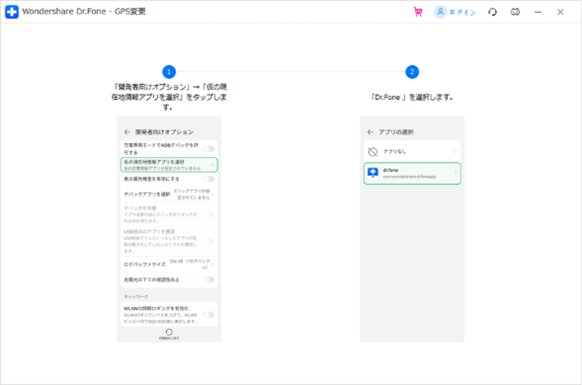 その後「開発者向けオプション」→「仮の現在地情報アプリを選択」→「Dr.Fone」を