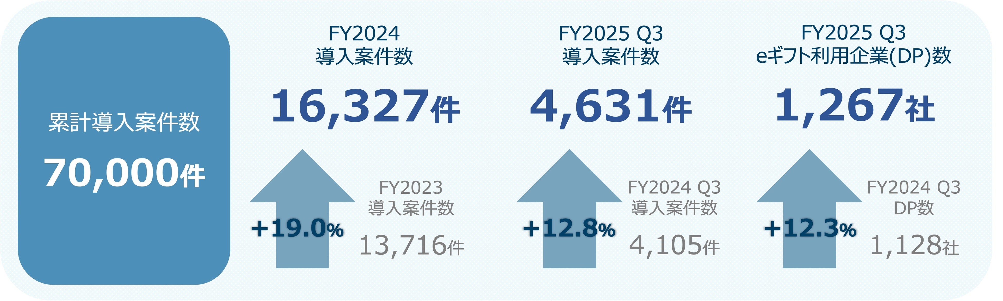 eギフトプラットフォーム事業(※1)を展開する株式会社ギフティ(本社:東京都品川区/代表取締役:太田 睦、鈴木 達哉/以下、ギフティ)は、2025年11月14日(金)に2025年12月期第3四半期決算を開示し、デジタルギフトの高い需要の継続により、法人および自治体向けサービス「giftee for Business」(※2)における売上高・案件数・導入企業(以下、DP)数ともに、前年同期を大きく上回る結果となったことを発表しました。また、「giftee for Business」は、2016年のサービス開始以来、サービス対象をBtoCに加え、BtoE、BtoB、GtoCに拡げるとともに、ギフトを贈る用途の開拓、ギフトコンテンツの拡充を背景に、堅調に案件数を伸ばしており、導入案件数が累計70,000件(2025年9月30日(火)時点)を突破いたしましたので、あわせてお知らせいたします。