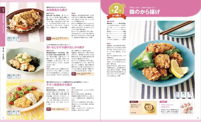 巻頭はハンバーグやから揚げなど、大人から子どもまで大人気のレシピをランキングで紹介。定番の作り方に加え、アレンジレシピも掲載しています。例えばから揚げ。しょうゆで下味をつけて揚げる定番の作り方の他に、ねぎとしょうがを刻み、調味料と合わせた香味だれを作ってかければ「油淋鶏風から揚げ」が作れます。また、里いもとなすを鶏肉といっしょに揚げ、めんつゆを使ったたれをかければ、しっかり味だけどさっぱり食べられる「里いもとなすの揚げ出しから揚げ」も。定番レシピ10品+アレンジレシピを各3品ずつ紹介します。