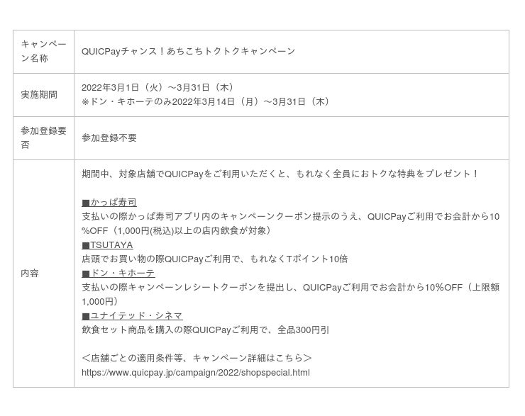 期間中、「かっぱ寿司」「TSUTAYA」「ドン・キホーテ」「ユナイテッド・シネマ」でおトクにQUICPayをご利用いただけます。