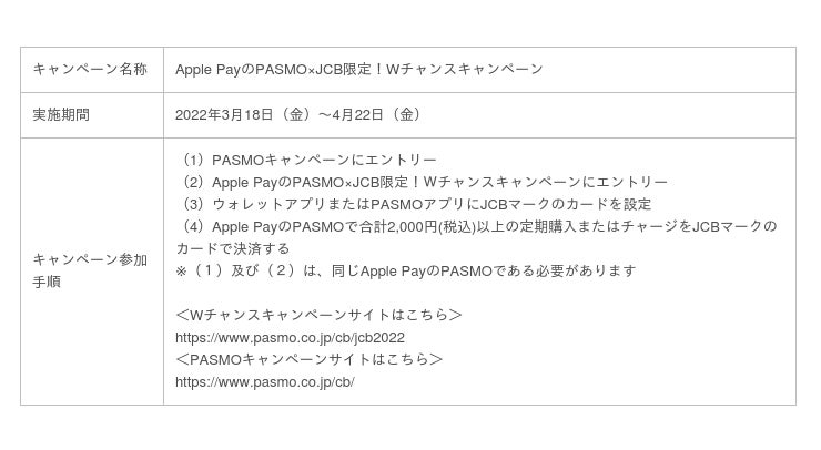 株式会社ジェーシービー (本社:東京都港区、代表取締役会長兼執行役員社長:浜川 一郎、以下:JCB)は、2022年3月18日(金)から4月22日(金)まで、JCBブランド会員を対象に「Apple PayのPASMO×JCB限定!Wチャンスキャンペーン」を開始したことをお知らせします。