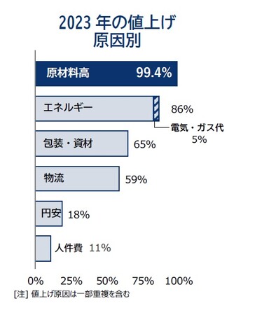 2023年に予定される値上げ1.8万品目のうち、原材料高が理由となったものは99%以上(品目数ベース)と、ほぼ全てで原材料高が理由にあげられた。また、供給不足が続く鶏卵価格高騰を理由とした値上げ、人件費上昇による値上げも目立ってきた。電気代などのエネルギー代や物流コスト、輸入コスト上昇も続き、製品価格へ緩やかに反映する動きが引き続き目立っている。