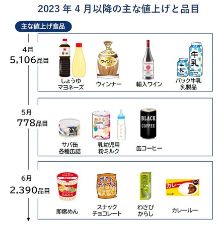 2023年4月単月の値上げ品目数は、加工食品を中心に5106品目だった。前年同月(1204品目)の4倍超に上るほか、今年2月以降3カ月連続で前年を上回った。5月以降も2022年を上回る水準の値上げが予定されており、5月は前年比3倍、6月には前年にほぼ並ぶ2390品目の値上げが予定される。7月以降も、4月に行われる輸入小麦の価格改定、電気代の引き上げなどを背景に断続的な値上げが続く。値上げは今春を一旦ピークとしながらも増加ペースは早まっており、4月中にも計画ベースで年内値上げ累計2万品目を突破するとみられる。