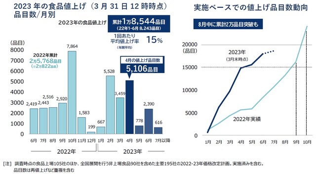 4月は今年2番目の値上げラッシュとなる。2023年における家庭用を中心とした飲食料品の値上げ品目数は、3月末までの判明ベースで累計1万8544品目に上った。このうち、4月1日をもって23年内に値上げ済みとなる食品は累計1万品目を超えた。また、今年1-6月までの累計品目数(1万7928品目)は、前年と同じ時期(22年1-6月:8243品目)に比べ2倍を超えるペースで推移している。