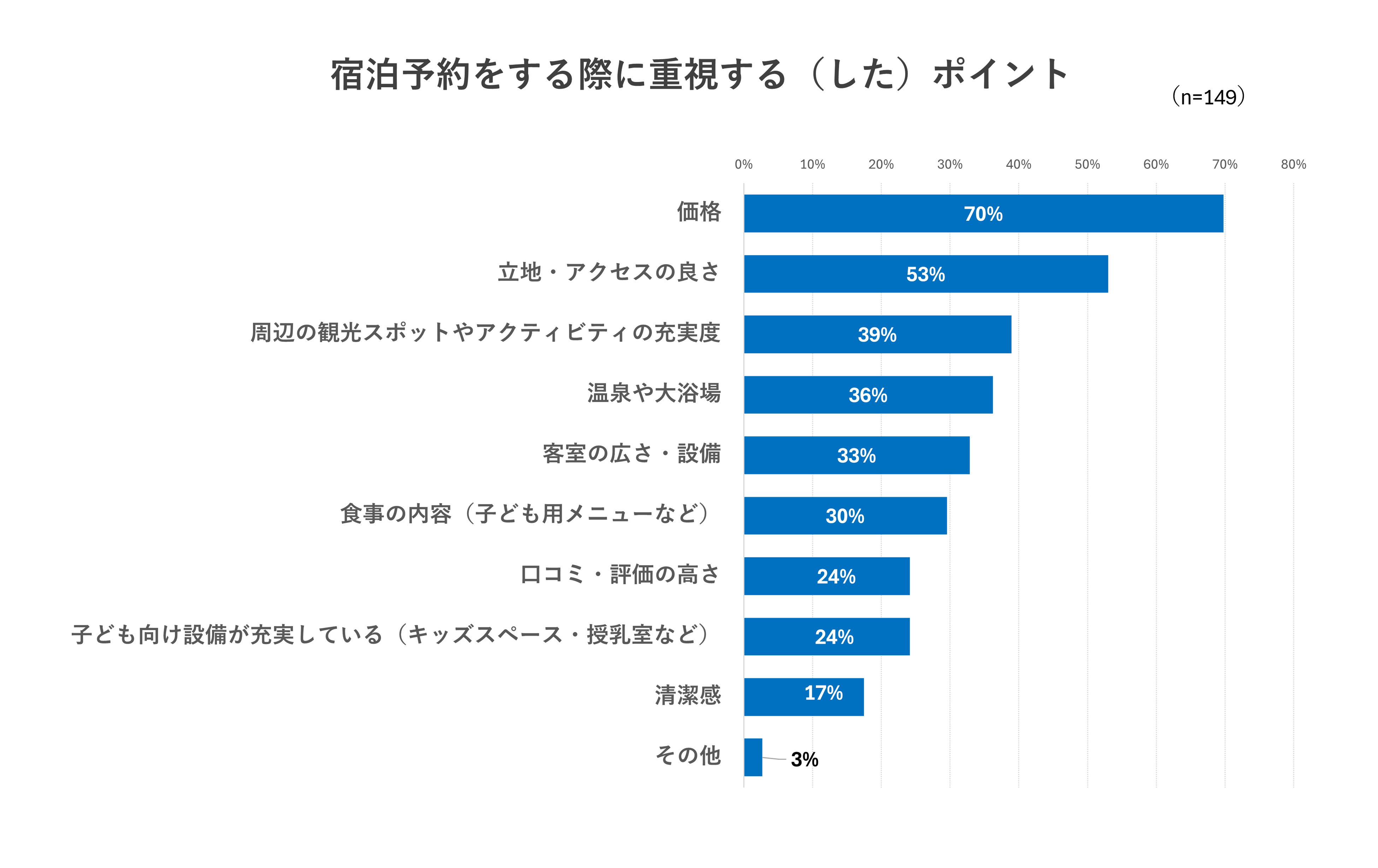 また、「周辺の観光スポットやアクティビティの充実度」が39%と続きました。現地で子どもが楽しめる場所があるかどうかは、子ども連れの宿泊先選びで重要なポイントになるといえます。