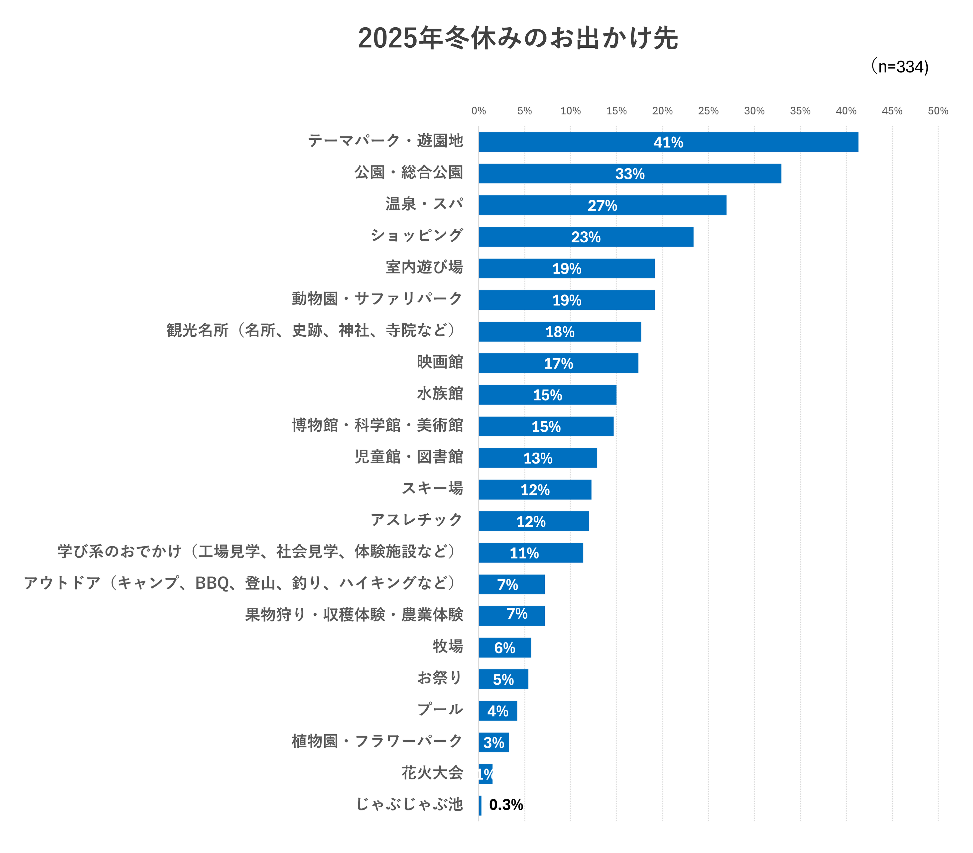 次いで、「公園・総合公園(33%)」が挙がり、屋外でのレジャーを楽しむ家庭も多くみられました。「温泉・スパ(27%)」も人気で、寒い季節にぴったりの、リフレッシュしながらゆっくり過ごせるスポットとして選ばれています。また、「ショッピング(23%)」も気軽に行きやすいスポットとして上位に入っています。