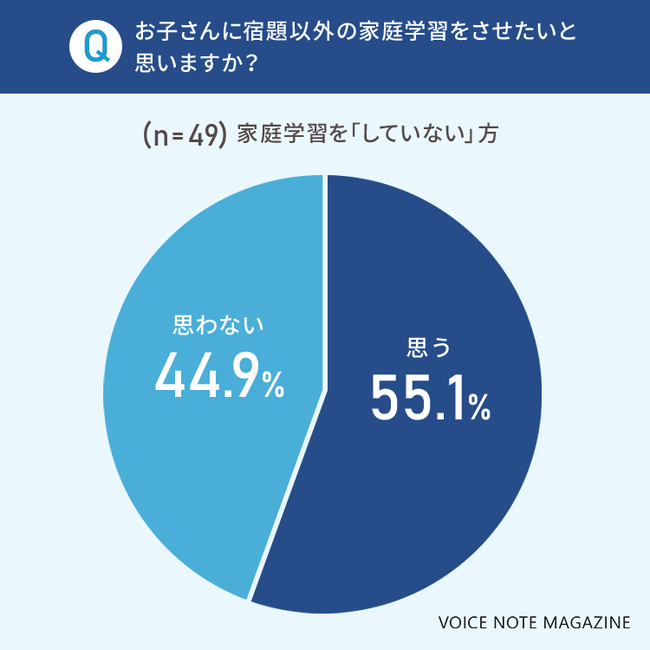 一方で、宿題以外の家庭学習をさせたいと「思わない」方も44.9%いるようです。