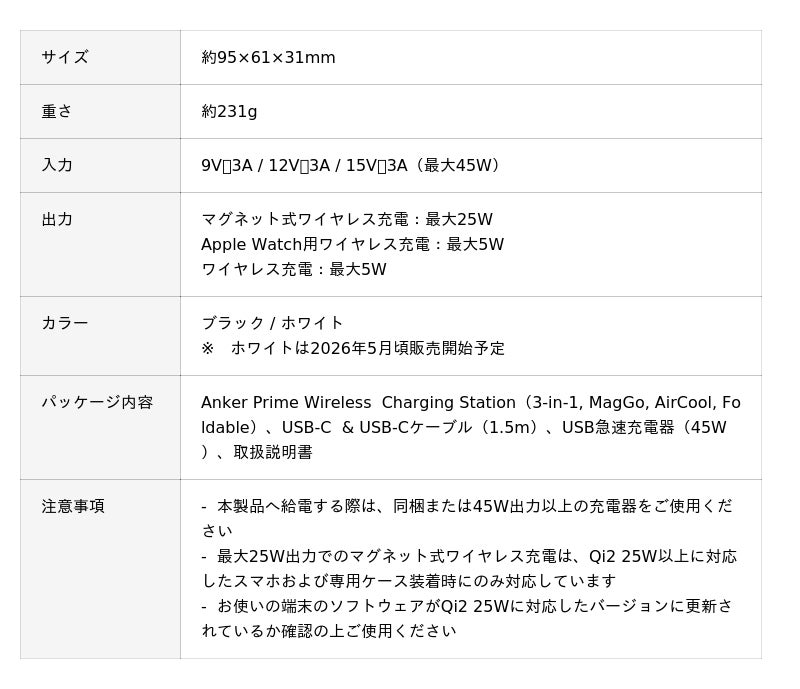 - 人気製品の次世代モデル:2025年にワイヤレス充電器カテゴリで国内売上金額No.1(※ 2025年1月〜12月における外部調査会社のデータをもとにした全国有力家電量販店の販売実績集計 / 大手ECプラットフォームのランキングをもとにした自社調べ)を達成した3-in-1ワイヤレス充電器「Anker MagGo Wireless Charging Station(Foldable 3-in-1)」の次世代モデルです。