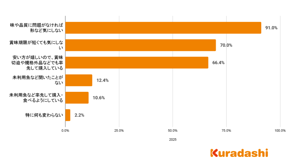 「味や品質に問題なければ形など気にしない」方が91.0%と最も多く、次いで「賞味期限が短くても気にしない」と回答した方が70.0%となりました。消費者は品質に問題がなければ、規格外品や訳あり品も購入し、価格面でのメリットを重視していることが分かります。