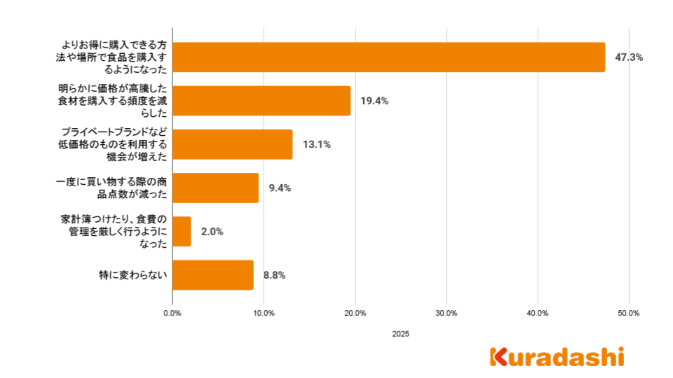 「よりお得に購入する方法や場所で商品を購入するようになった」という方が全体の47.3%(昨年比+3.2%)となり、次いで「明らかに価格が高騰した食材を購入する頻度を減らした」が19.4%となりました。消費者が食材の価格に敏感化し、節約志向が強まっていることが分かります。