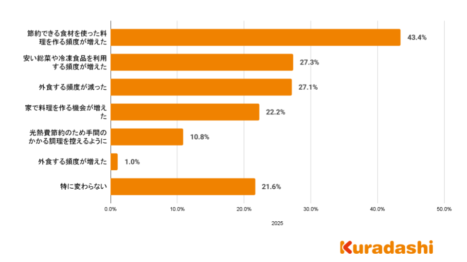 「節約できる食材を使った料理を作る頻度が増えた」が最も多く43.4%でしたが、昨年より4.6%減少しました。一方、「特に変わらない」と回答した方は21.6%(昨年比+1.8%)で、高止まりする物価高への対応が難しい状況がうかがえます。