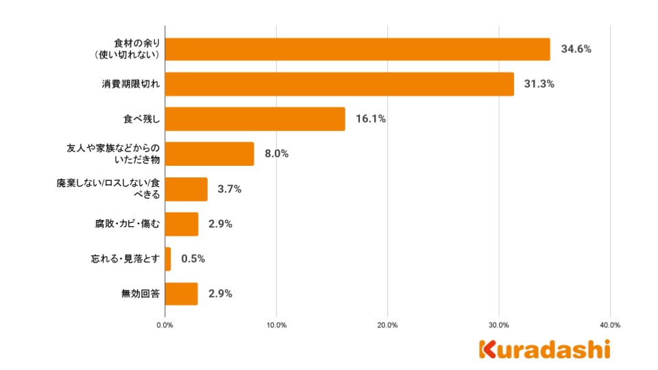 「食材の余り(使い切れない)」が最も多く34.6%でした。次いで「消費期限切れ」と回答した方が31.3%となり、「買ったことを忘れていた」「腐ってしまった」といった理由も含めると34.7%となります。一方で、「我が家ではロスを出さない」「必ず食べきるようにしている」と回答した方は3.7%であり、フードロスへの意識が徐々に高まっていることがうかがえます。