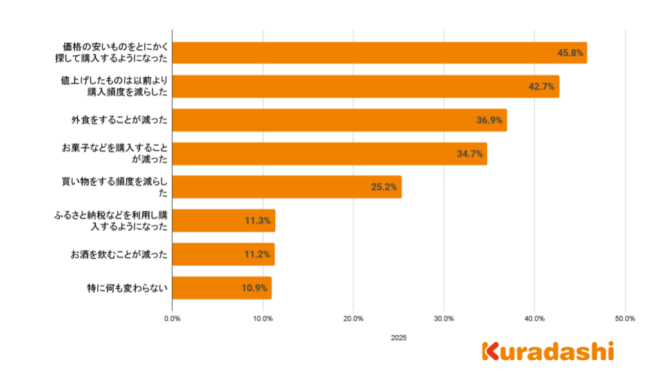 「価格が安いものをとにかく探して購入するようになった」と回答した方は45.8%、「値上げしたものは以前より購入頻度を減らした」は42.7%でした。お菓子やお酒の購入を控える傾向も過去調査(※2)より増加しており、物価高騰により、価格重視の購買や購入頻度の調整だけでなく、必要最低限の食材購入が一般化していることが分かります。