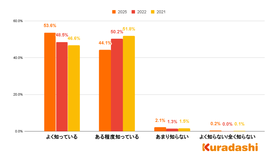 - フードロスの課題を「よく知っている」と回答した方は53.6%で、3〜4年前より約5〜7%増加、生活者の認知度は上昇傾向にある 。